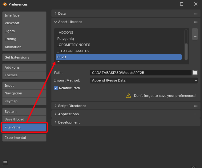 If your PF2B directory is already a subfolder of an existing Asset Library path, the assets will be accessible but without the PF2B category structure. To enable the categorized view from the blender_assets.cats.txt file, you need to add the PF2B directory as its own Asset Library path.