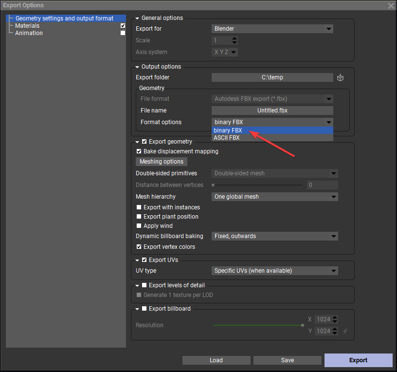 This error is caused by using the wrong FBX format setting in PlantFactory. Unfortunately, the addon cannot control this automatically, so you’ll need to set it manually. Luckily, it’s a quick fix: