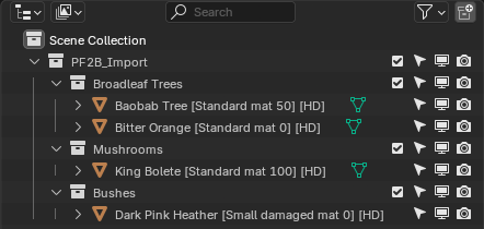 Categorize into Collections: Automatically place imported plants into sub-collections (e.g. Broadleaf Trees, Bushes, Grass) for easier scene organization.